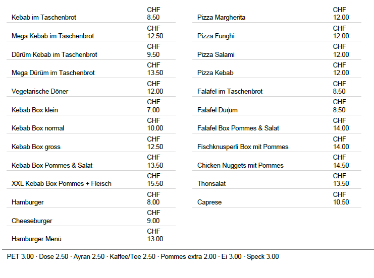 Vielfalt ist unser Markenzeichen: Ob du Lust auf herzhafte Fleischgerichte hast oder lieber vegetarisch geniesst – bei Sonnmatt Imbiss Jusefi findest du genau das, worauf du Appetit hast. Jede Kategorie unserer Speisekarte wurde mit Sorgfalt zusammengestellt, um dir höchste Qualität und vollen Geschmack zu bieten.